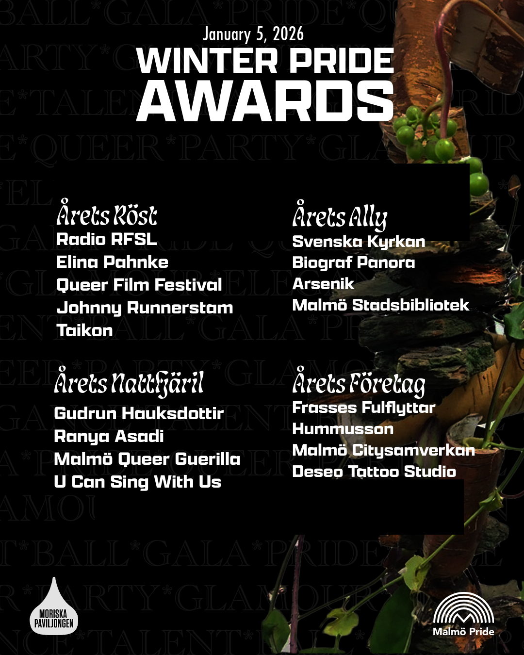 See you at the Moriska Paviljongen where we mingle on the red carpet and hand out awards in the main hall - because surely we want to lift up Malmö's queer icons and pillars?